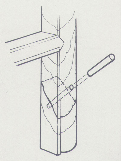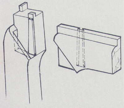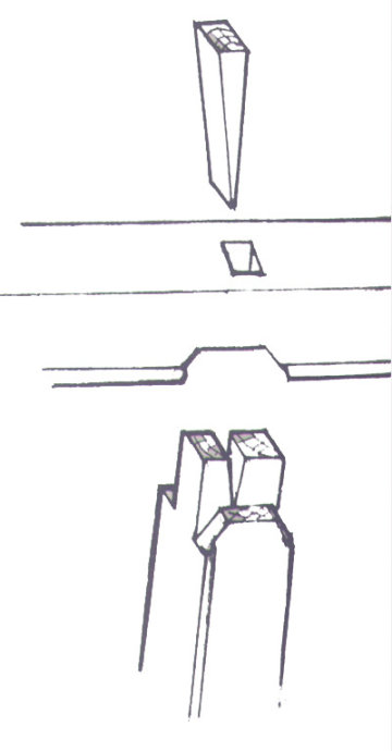半榫破頭楔(圖)破頭楔用在半榫之內,易入難出。破頭楔一旦在半眼的卯里撐開后,榫頭將很難再退出,是一種沒有可逆性的獨特而堅固的結構,最適宜用在像抽屜桌桌面下的矮老等懸垂而負重的部件上。這種作法不常使用,因為它沒法修復,被稱為“絕戶活”。