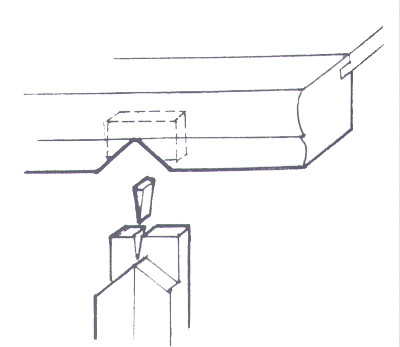 破頭楔(圖)通常是在透榫端部的靠近外側的適當位置,預先鋸開楔口,待榫入卯后,再備入楔子,使榫頭體積加大。此楔口也可以臨備楔前用鑿子刻開。常用在攢邊的桌面、椅面、床面的四角等結構部位的透榫上。