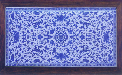 紅木炕桌上的青花鑲面、清、嘉慶(圖)鑲嵌是清式家具的主要裝飾手法之一,繼承前代業已成熟的技藝基礎之上,又在鑲嵌材料上有所擴展。同一時期的南方瓷業也相當發達,制瓷工藝領先于世界各國,象這樣大面積高溫瓷板不變形,而且釉色統一的桌面,在當時并不罕見。