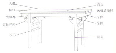夾頭榫畫各部位名稱(圖)畫案的尺寸要大于半桌,與長條桌的區別就在于它的面較寬。畫梁與書案的區別在于前者不設抽屜而后者有抽屜。這種夾頭榫畫案是明式家具中畫案類的典型造型。
