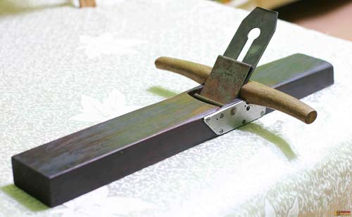 刮刀:一種薄細的刀片,用較軟的鋼材制成。平直的刮刀用于做平面,有弧度的可以刮有弧度的木件。使用時一般雙手握著,用大拇指抵住中間,與木面成一定斜度向前推(見下圖